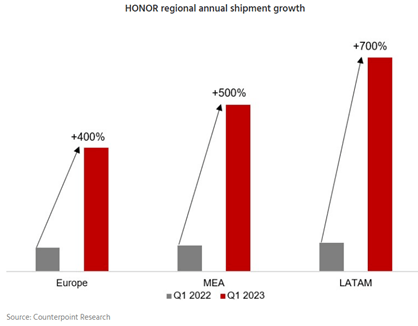 Según Counterpoint, Latinoamérica se ha convertido en la región de mayor crecimiento de HONOR en el extranjero, con un aumento de los envíos de casi ocho veces anual y se triplicaron en el Q1 de 2023 en comparación con el Q4 de 2022.