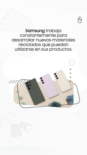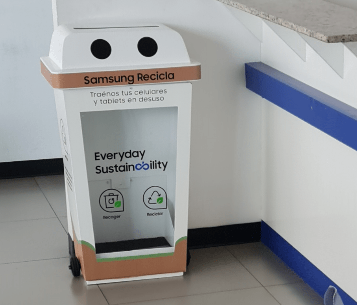 - Puntos de recolección de celulares viejos: A través del programa Samsung Recicla, los usuarios pueden entregar sus celulares, tablets y cargadores en desuso o dañados y la empresa se encarga de su procesamiento gratuito y reciclaje responsable a través de los Eco Box, no solo de productos Samsung, sino de cualquier marca. Cualquiera puede deshacerse de ellos en nuestros puntos de recogida, para que podamos encargarnos de la última etapa del ciclo de vida del producto por usted.