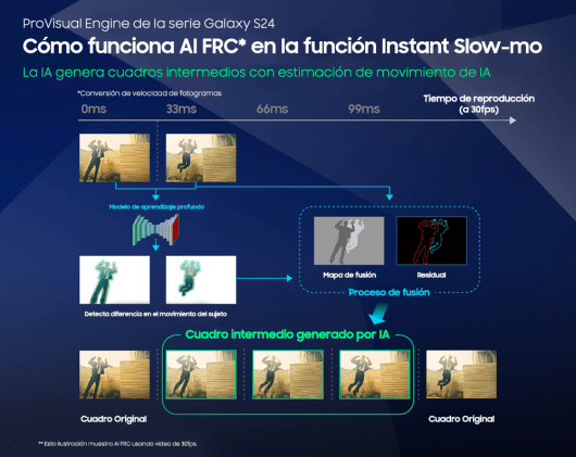 Para lograr estos efectos de cámara lenta, la serie Galaxy S24 utiliza una potente tecnología AI Frame Rate Conversion (FRC):