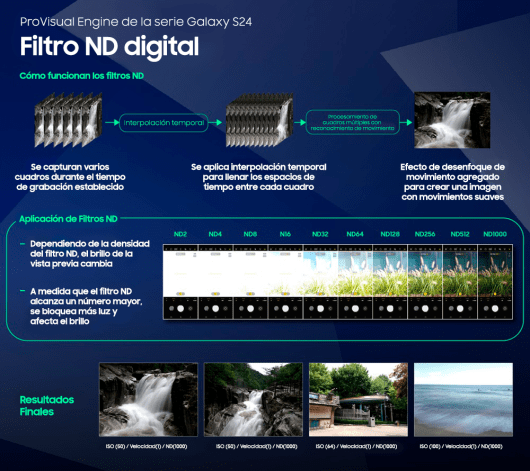 10 tipos de filtros ND: los filtros de densidad natural (ND, su sigla en inglés) a menudo se adjuntan a cámaras de nivel profesional para ayudar a limitar la luz, reducir el ruido o prolongar la exposición. No se requieren accesorios, con 10 filtros ND diferentes integrados en la cámara de la serie Galaxy 24 para máxima elección y control por parte del usuario. Las fotografías filtradas con ND sintetizan varios cuadros a la vez y analizan el movimiento de los objetos para crear una imagen fija con una clara sensación de movimiento vivo en, por ejemplo, fotografías de olas o cascadas.