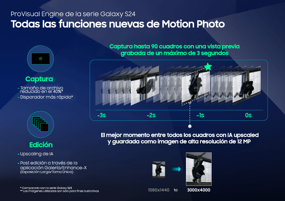 Gracias a un conjunto de herramientas de cámara versátiles y funciones de edición impulsadas por ProVisual Engine de Samsung, la serie Galaxy S24 se despide de las molestias, los problemas con las configuraciones y la edición que requiere mucho tiempo para disfrutar de una experiencia fotográfica nueva y sin esfuerzo. Ya sea una visión espontánea como la de tu perro saltando una valla o un momento sincero en una reunión familiar, estarás preparado para preservar momentos fugaces con velocidad y precisión.